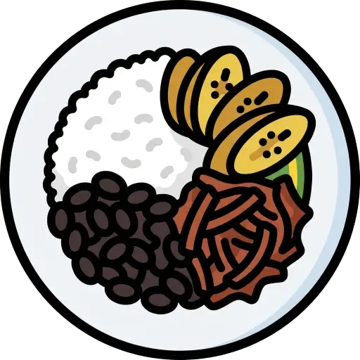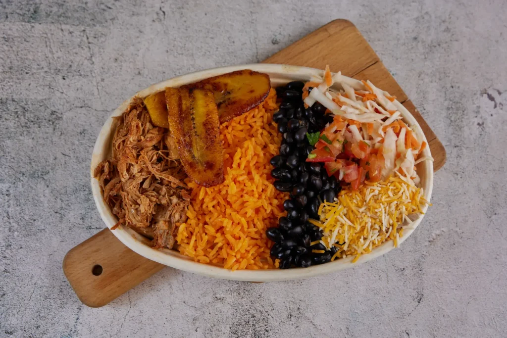 A balanced mix of rice, beans, plantains, and fresh toppings—hearty and satisfying.