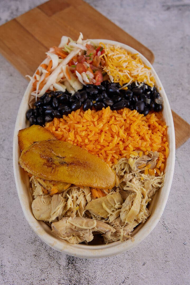 A wholesome bowl made with seasoned rice, black beans, sweet plantain, melted cheese, fresh pico de gallo, and tender shredded chicken.